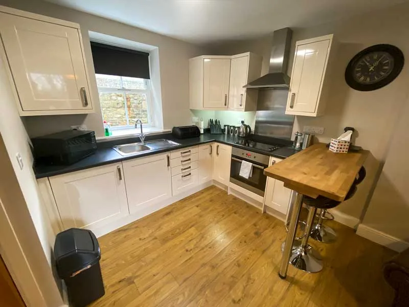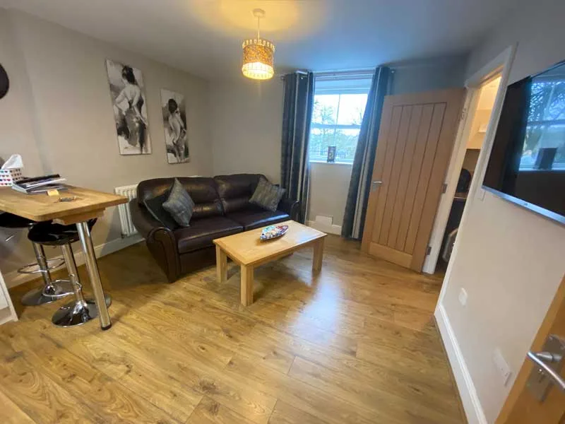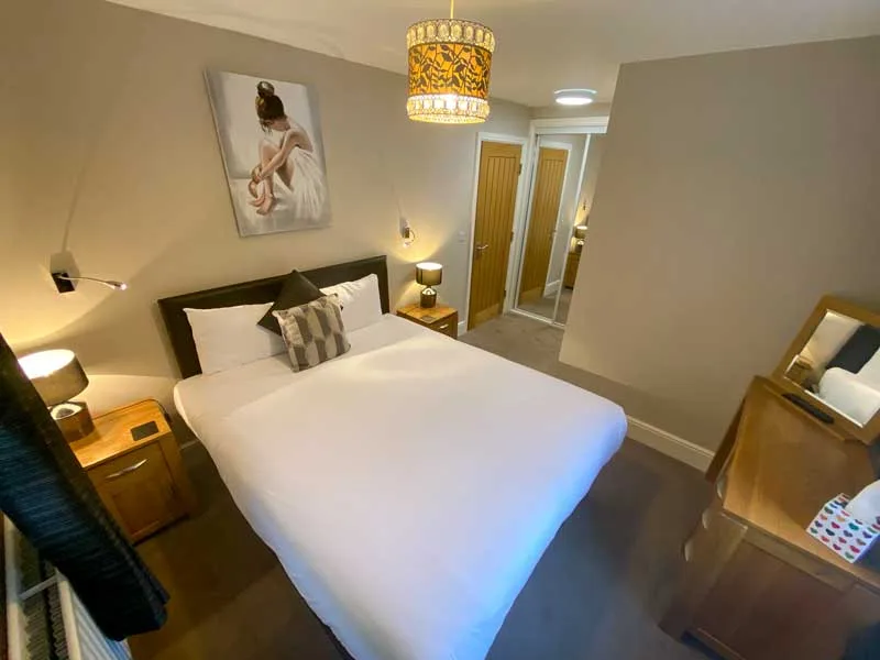 1 x Studio Apartment with kitchen, small living space and bedroom. King size bed with en-suite shower room, flat screen TV in bedroom and living area. Kitchen area with appliances. Includes Full English breakfast over at the main hotel building.